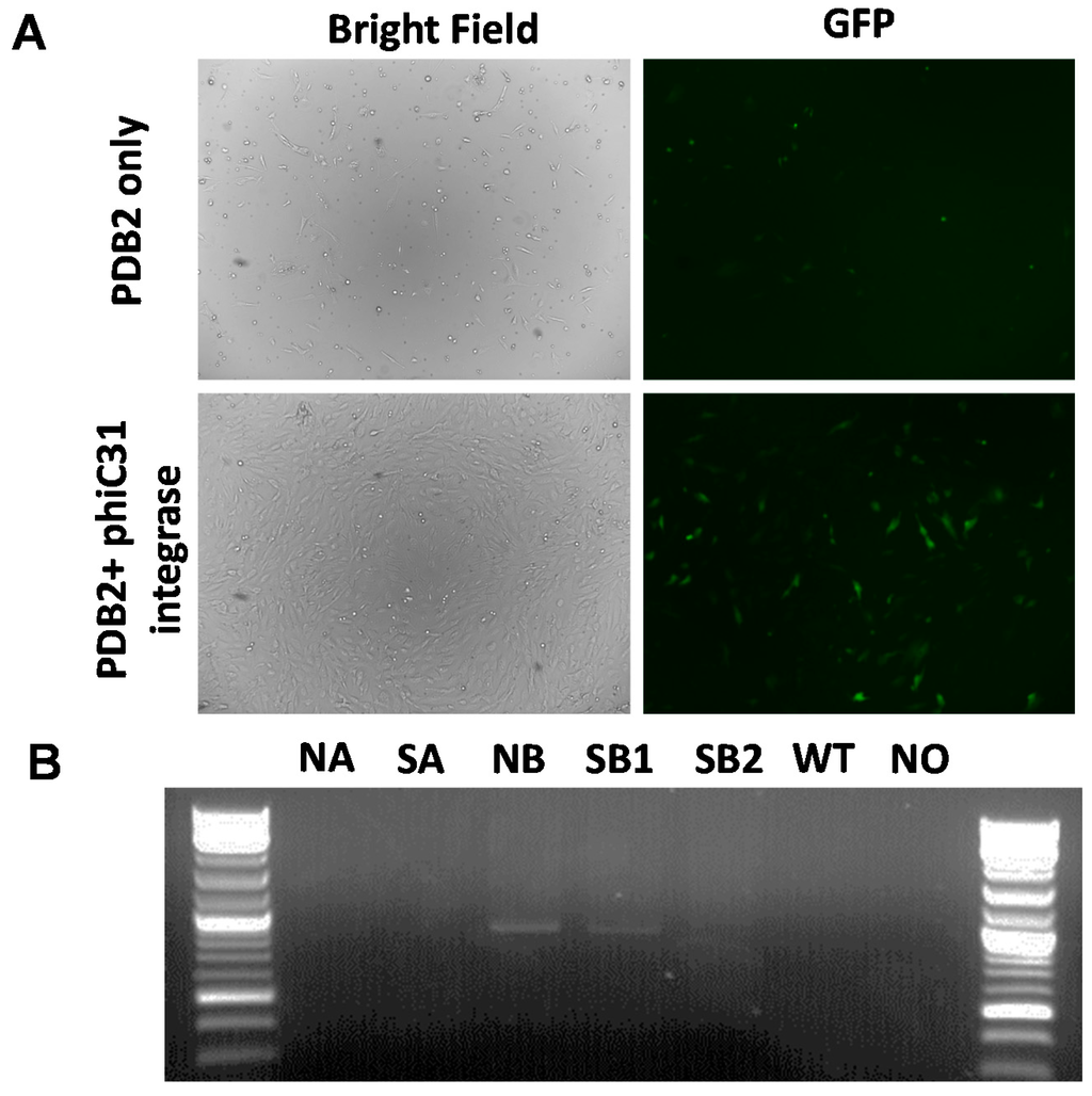 phiC31 integrase mediated integration of GFP transgene into COL1A targeted clonal lines. (A) Brightfield and fluorescent micrographs (100× magnification) showing integration and expression of GFP transgene in COL1A knockin lines in the absence (top panel) or presence of integrase (bottom panel); (B) PCR amplicons showing targeted knockin of GFP transgene into the target sites. The cells following nucleofection and G418 selection and sorting were analyzed by PCR. Amplicons that show knockin were identified only in the presence of integrase and not in vector only treatment, wild type parent cells and no-template controls.