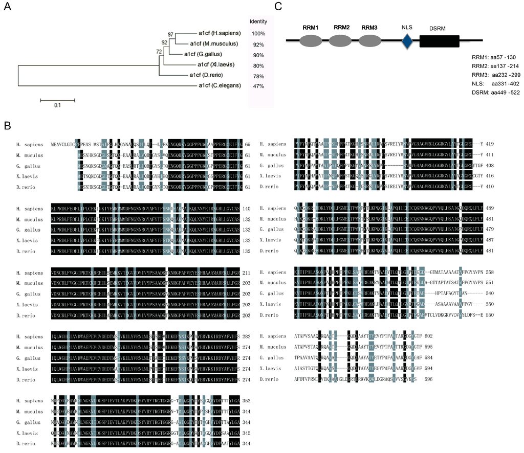 A1CF is conservative on evolution via bioinformatics analysis. (A) High conservation of A1CF across species in the schematic diagram of phylogenetic analysis. The similarity of amino acids sequences among species was shown as percentage; (B) Amino acids sequences alignment of A1CF among Homo sapiens, Mus musculus, Gallus gallus, Xenopus laevis, and Denio rerio. The identical amino acids were shaded in black and the similar amino acids were in grey; and (C) the predicted protein structure of mus-A1CF on the net. It contains three non-identical RRM on the N terminus, a nucleus localization signal, and a dsRBM on its C terminus, RRM, RNA recognition motif. ASN, A1CF specific nuclear signal. DSRM, double-strand RNA binding motif.