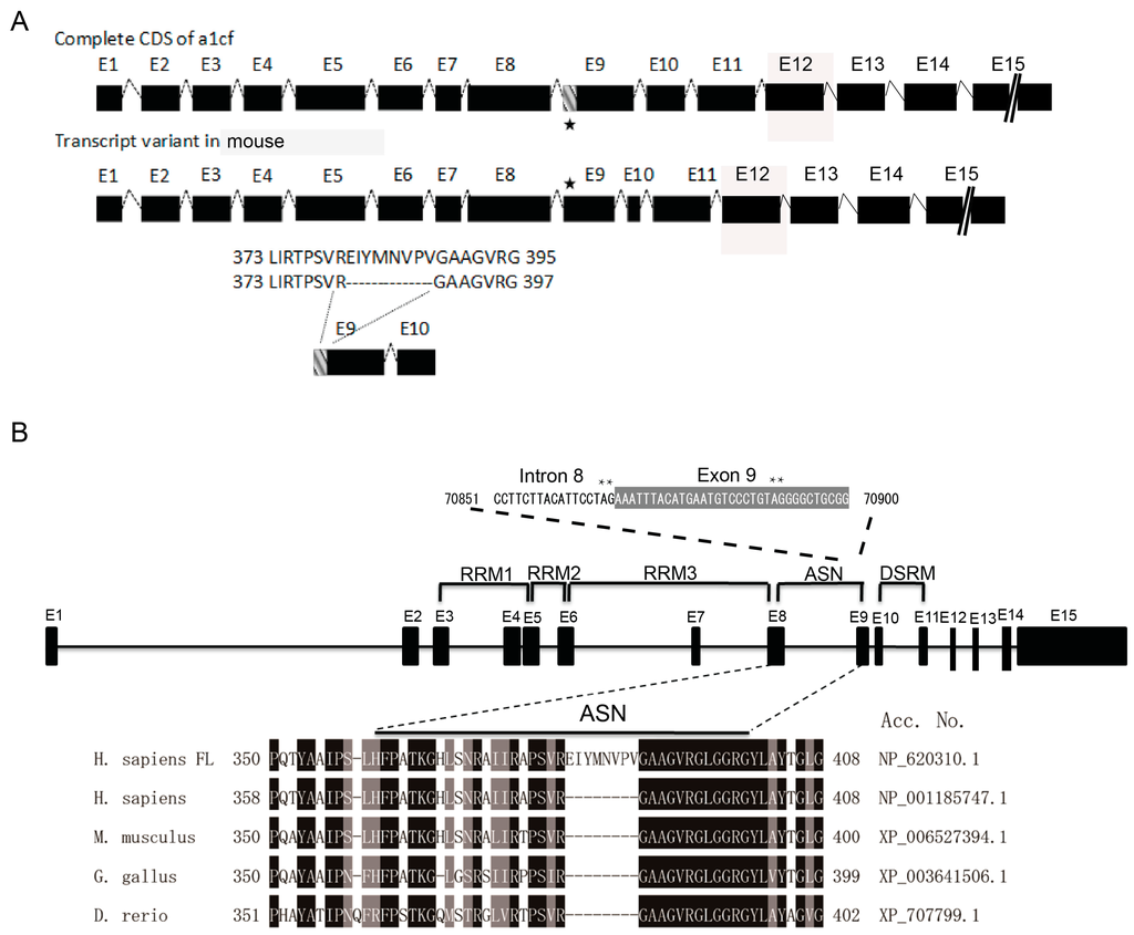 The conservation analysis of the EIYMNVPV motif deficiency (A) exon pattern of mouse a1cf transcript and its alternatively-spliced variant A1CF (-8aa).An alternative splice in exon 9 results in a deletion of the EIYMNVPV motif. As the pentagram shows, this alternative splice takes place in the 5’ terminus of exon 9; and (B) the conservation of the EIYMNVPV motif deficiency among H. sapiens, M. musculus, G. gallus, and D. rerio. Human full length A1CF (FL) was used for comparison with A1CF (-8aa) from human, mouse, chicken, and zebrafish respectively, the asterisks represent an alternative splice acceptor site in the anterior region of exon 9. The identical amino acids were shaded in black and the similar amino acids were in grey.