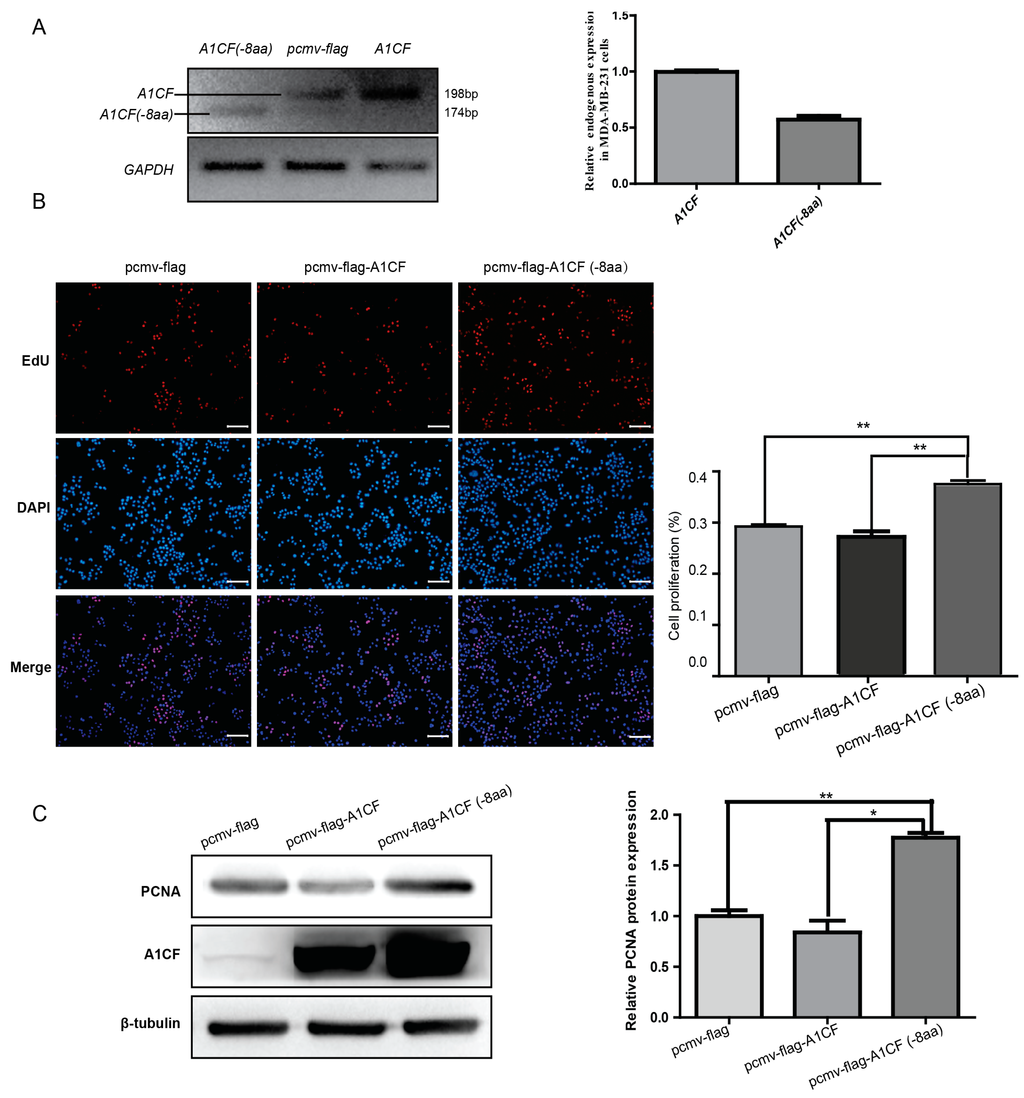 To uncover the biological significance of A1CF (-8aa), we firstly investigate the expression pattern of A1CF and A1CF (-8aa) in MDA-MB-231 cells, a breast tumor cell line. Semi-quantitative PCR was used to analyze the relative expression abundance of A1CF and A1CF (-8aa). As shown in Figure 4a, the predominant transcript isoform is A1cf, while weak expression of A1CF (-8aa) can be observed. Quantitative analysis indicated that A1CF showed twice the expression than that of A1CF (-8aa). As is reported, RBM47 could replace A1CF, and regulate APOBEC1-mediating mRNA editing in vitro [14]. Additionally, it participates in the breast cancer progression via modulating mRNA stability [15]. To verify the possible correlation between A1CF (-8aa) and basal-like breast cancer cells, we respectively transfected MDA-MB-231 cells with A1CF (-8aa), A1CF and control vector for 36 h. The 5-Ethynyl-20-deoxyuridine (EdU) and the expression of PCNA were examined to evaluate the proliferation effect of A1CF (-8aa) and A1CF on MDA-MB-231 cells. PCNA plays an important role in DNA synthesis, DNA repair, cell cycle progression and cell proliferation [28,29]. As Figure 4B displayed, the ratio of proliferative cells was increased in MDA-MB-231 cells treated with A1CF (-8aa). In line with the EdU incorporation assay, PCNA, a marker for proliferation, showed increased expression in A1CF (-8aa)-transfected cells but not in A1CF-transfected cells as detected by Western blot (Figure 4C). All in all, the above findings indicated that A1CF (-8aa) rather than A1CF promote the proliferation of MDA-MB-231 cells.