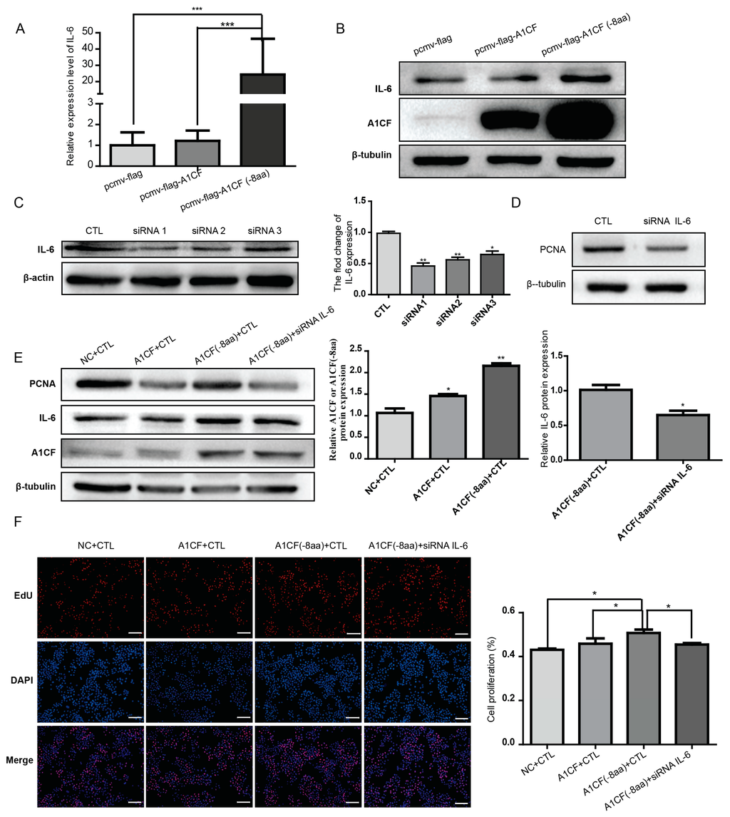 It has been reported that A1CF can promote liver regeneration via IL-6 by stabilizing IL-6 mRNA [9]. Furthermore, IL-6 has been proved to play a vital role in breast cancer progression and prognosis. To unravel whether IL-6 mediates A1CF (-8aa)-promoted proliferation, we first checked whether A1CF (-8aa) could enhanced the expression of IL-6. As illustrated in Figure 5A and B, expression level of both mRNA and protein of IL-6 increased in MDA-MB-231 cells transfected with A1CF (-8aa), but not in cells transfected with A1CF. To further clarify the effect of IL-6 in A1CF (-8aa)-mediated proliferation, RNA silence was used to knockdown IL-6. Three siRNA oligos were designed to screen the siRNA showing best expression silence of IL-6. As determined by western blot in Figure 5C, siRNA1 demonstrated best gene silence efficiency (more than 50% compared with control group). Thus, siRNA1 was used for downstream investigation. Transfection of IL-6 siRNA alone can downregulate the expression of PCNA in MDA-MB-231 cells (Figure 5D). Most importantly, knockdown of IL-6 can reverse the increased expression of PCNA stimulated by A1CF (-8aa) (Figure 5E). In accordance with decreased expression of PCNA, IL-6 knockdown can also rescue enhanced proliferating cell proportion induced by A1CF (-8aa) as determined by EdU incorporation assay (Figure 5F).