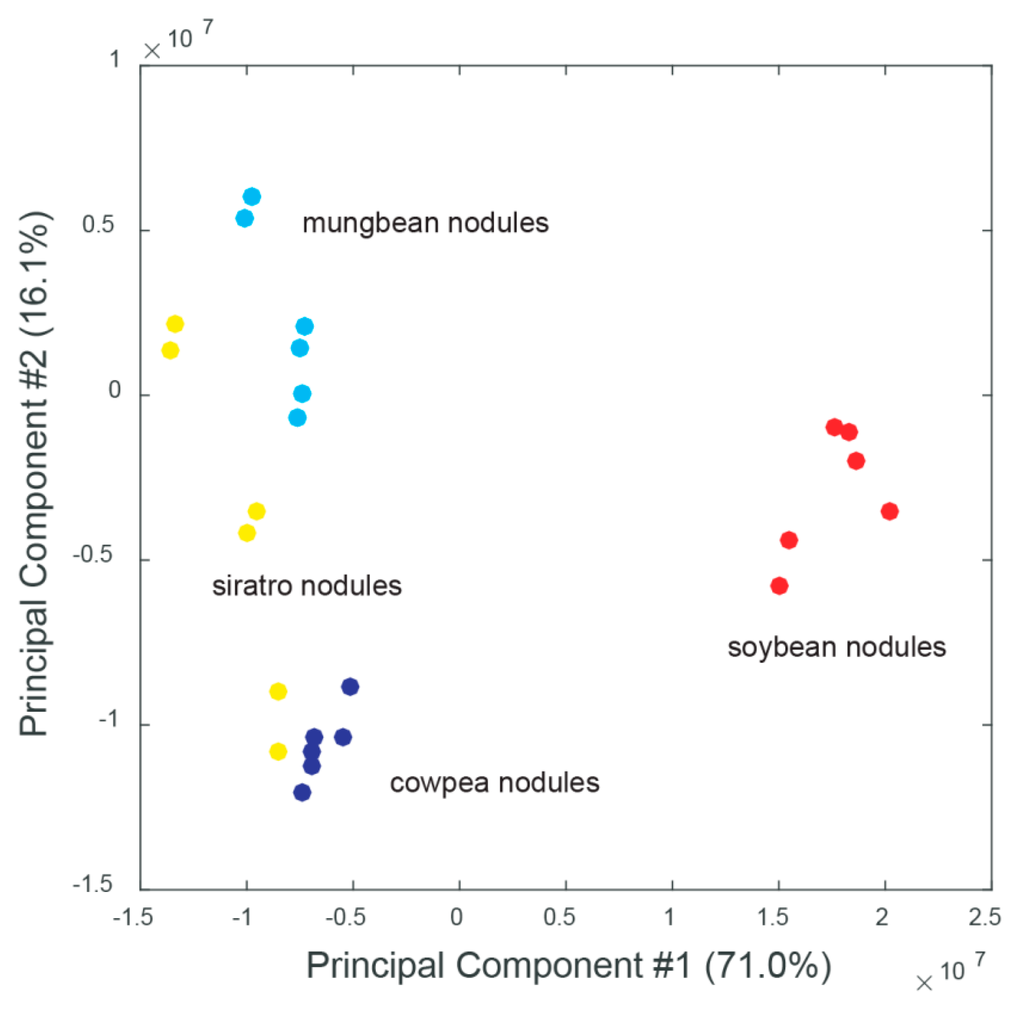 Principal component analysis (PCA) of metabolome datasets obtained from soybean (red); mungbean (light blue); cowpea (blue) and siratro (yellow) root nodules. Three biological replicates were examined, each analyzed twice by non-targeted metabolomics; #: number.