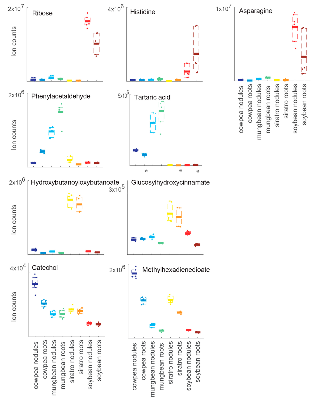 Ion counts of host-specific metabolic markers such as sucrose, asparagine, pentose (ribose) and histidine for soybean, tartaric acid and phenylacetaldehyde for mungbean, hydroxybutanoyloxybutanoate and glucosylhydroxycinnamate for siratro, and methylhexadienedioate and catechol for cowpea nodules and roots. Three biological replicates were examined, each analyzed twice by non-targeted metabolomics.