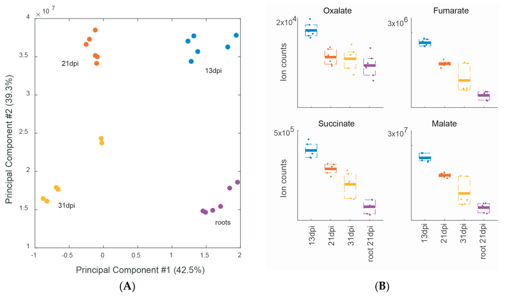 PCA of soybean wild-type nodules at different developmental stages: 13 dpi (blue), 21 dpi (red) and 31 dpi (yellow); root only material (purple); #: number (A); Three biological replicates were examined, each analyzed twice by non-targeted metabolomics; Differential accumulation of oxalate and C4-dicarboxylates (B).