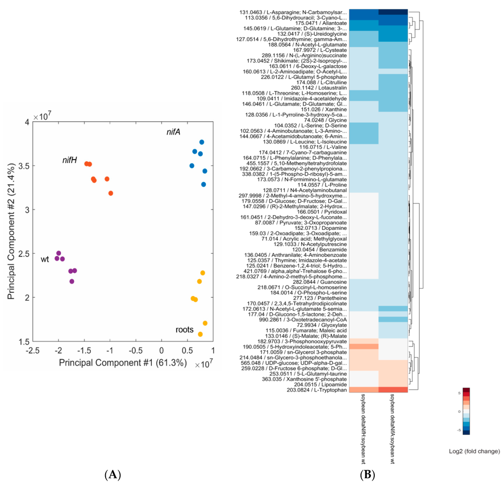 PCA of metabolite profiles from soybean wild-type nodules (purple), nifA nodules (blue), nifH nodules (orange) and soybean root only material (yellow) metabolite profiles; #: number (A); Three biological replicates were examined, each analyzed twice by non-targeted metabolomics. Significantly different metabolites (abs[log2(fold-change)] > 0.5 and q-value < 0.01 in at least one comparison); Metabolite ions were clustered for purposes of visualization (B).