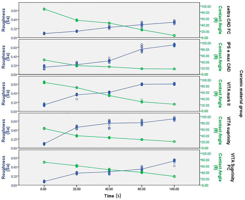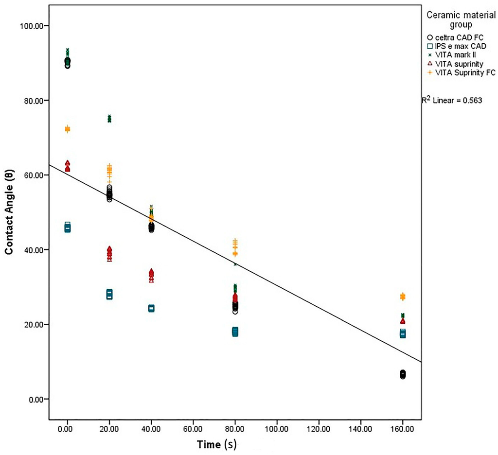 | Material | Mean Contact Angle (Mean ± SD) | p-Value | ||||