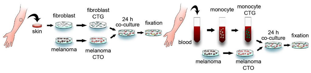 Each melanoma cell line stained with 6 µmol/mL CellTracker Orange (CMTMR) was mixed either with fibroblasts or with freshly isolated monocytes labeled with 10 and 4 µmol/mL CellTracker Green (CMFDA, both from Life Technologies, Carlsbad, CA, USA), respectively, and grown in co-cultures for 24 h. The fibroblast-containing co-cultures were grown in low glucose DMEM supplemented with 5% fetal bovine serum, while the monocyte-containing co-cultures in RPMI 1640 (HEPES modification) with 10% fetal bovine serum and 30 IU/mL GMCSF (R&D Systems). All growth media were supplemented with 1% Penicillin/Streptomycin and 1% Glutamine. All cell culture reagents used are products of Lonza (Basel, Switzerland), if not specified otherwise.