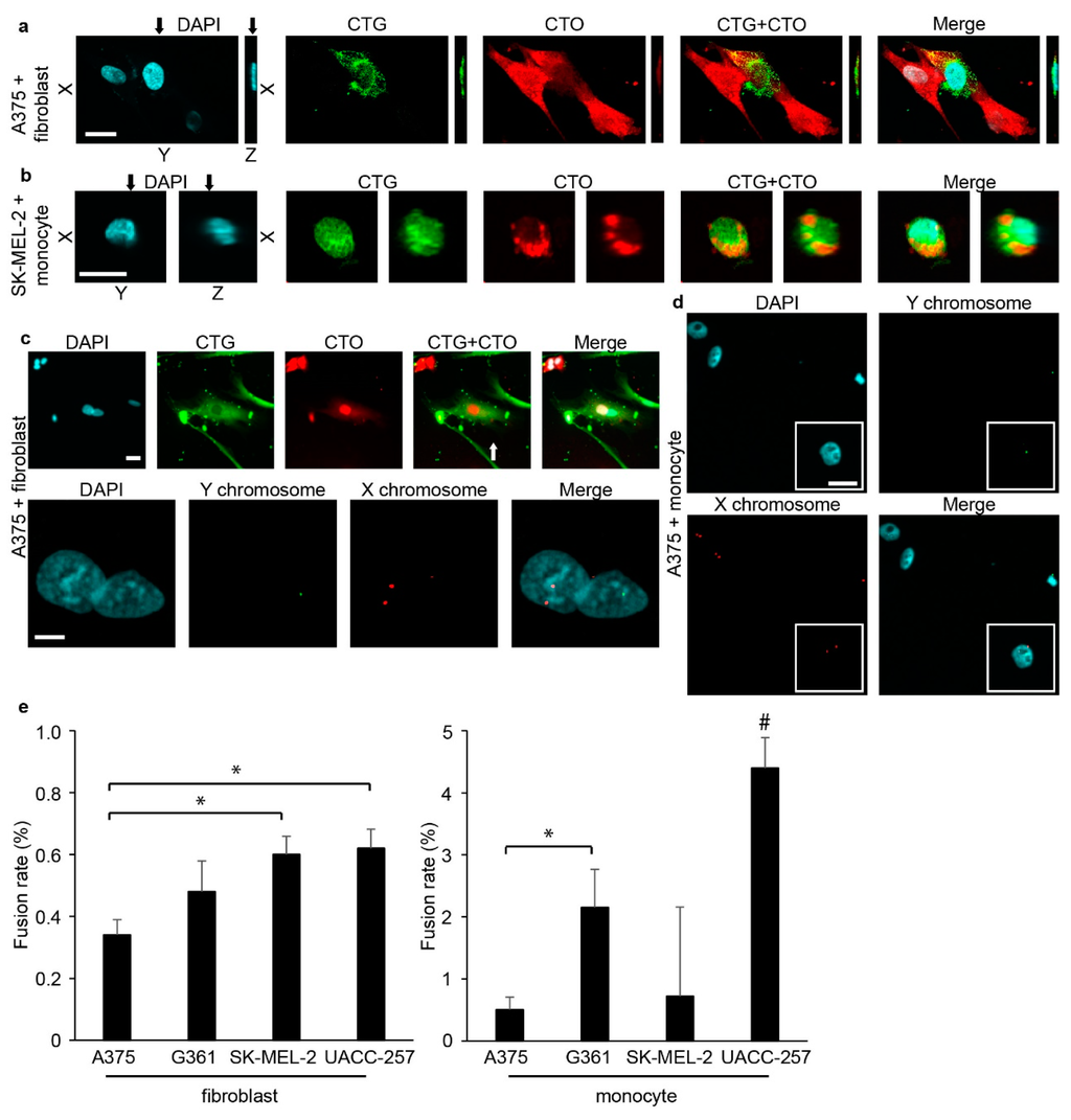Melanoma cells spontaneously fused with primary human dermal fibroblasts and monocytes. (a,b) A melanoma (CTO)–fibroblast (CTG) (a) and a melanoma (CTO)–monocyte (CTG) (b) hybrid visualized with a confocal microscope in X-Y and X-Z planes. The Z-stacking confirms that double positivity does not result from cells lying on each other. Black arrows indicate the crossline of planes; white bars indicate 20 µm (a) and 10 µm (b). (c) A melanoma (CTO)–fibroblast (CTG) hybrid confirmed with confocal microscopy contains a nucleus from a female melanoma cell and another from a fibroblast from a male donor (upper row). Fluorescent in situ hybridization visualizing three X (red) and one Y (green) chromosome in the same cell (lower row). White bars indicate 30 µm (upper row) and 10 µm (lower row). (d) Fluorescent in situ hybridization visualizing two X (red) and one Y (green) chromosome in a melanoma (female)–monocyte (male) hybrid cell. White bar indicates 10 µm. (e) The percentage of hybrid cells compared to the total number of melanoma cells and fibroblasts or to the total number of melanoma cells and monocytes after 24 h of co-culture measured with flow cytometry. All investigated melanoma cell lines fuse spontaneously with human dermal fibroblasts (left panel) and peripheral blood-derived monocytes (right panel). Means of three experiments + SD are shown. * indicates significant differences between the marked groups. # indicates a significant difference between the marked group and all the other groups. p < 0.05. DAPI: 4′,6-Diamidin-2-phenylindol.