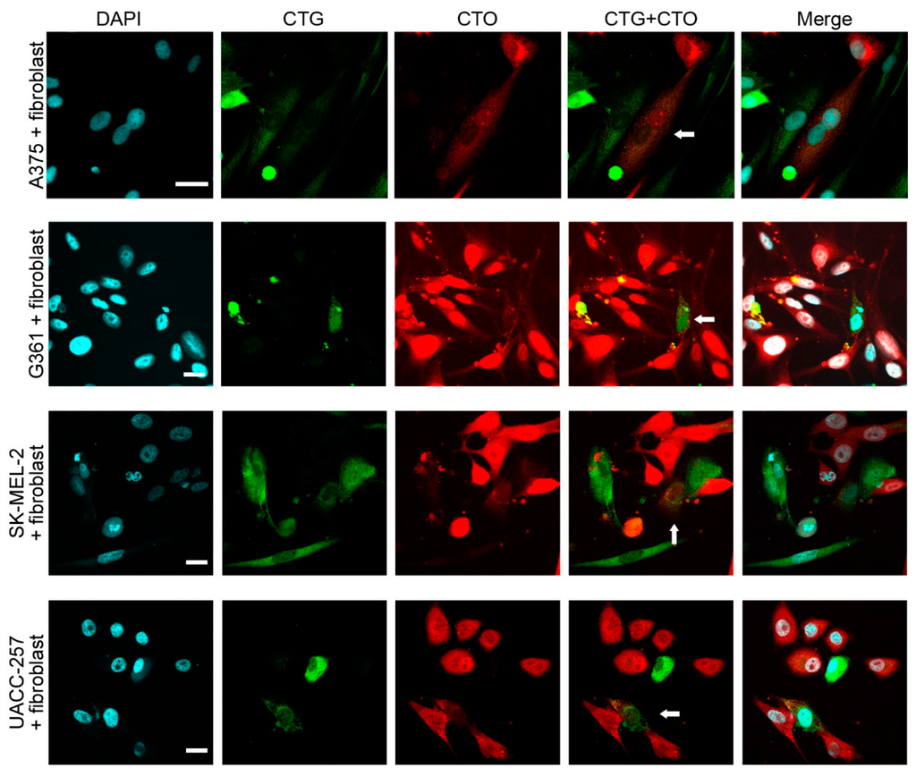 Melanoma–fibroblast hybrids are indistinguishable from stromal cells based on cell morphology. Spontaneously formed melanoma (CTO)–fibroblast (CTG) hybrids (white arrows) from different melanoma cell lines adopt the morphology of fibroblasts. White bars indicate 20 µm.
