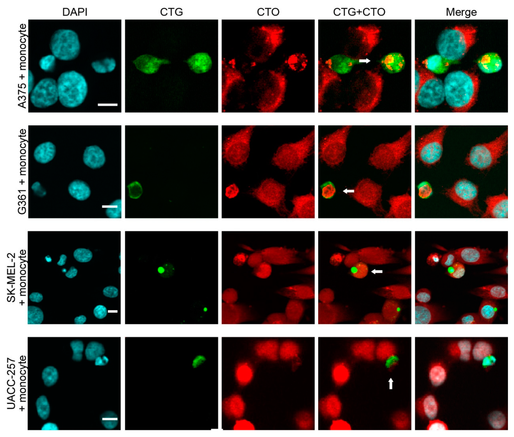 In vitro cell fusion model. Primary human dermal fibroblasts (left panel) or human peripheral blood-derived monocytes (right panel) labeled with CellTracker Green (CTG) were co-cultured with human melanoma cells labeled with CellTracker Orange (CTO) for 24 h. The samples were subsequently fixed and analyzed with a fluorescent microscope.