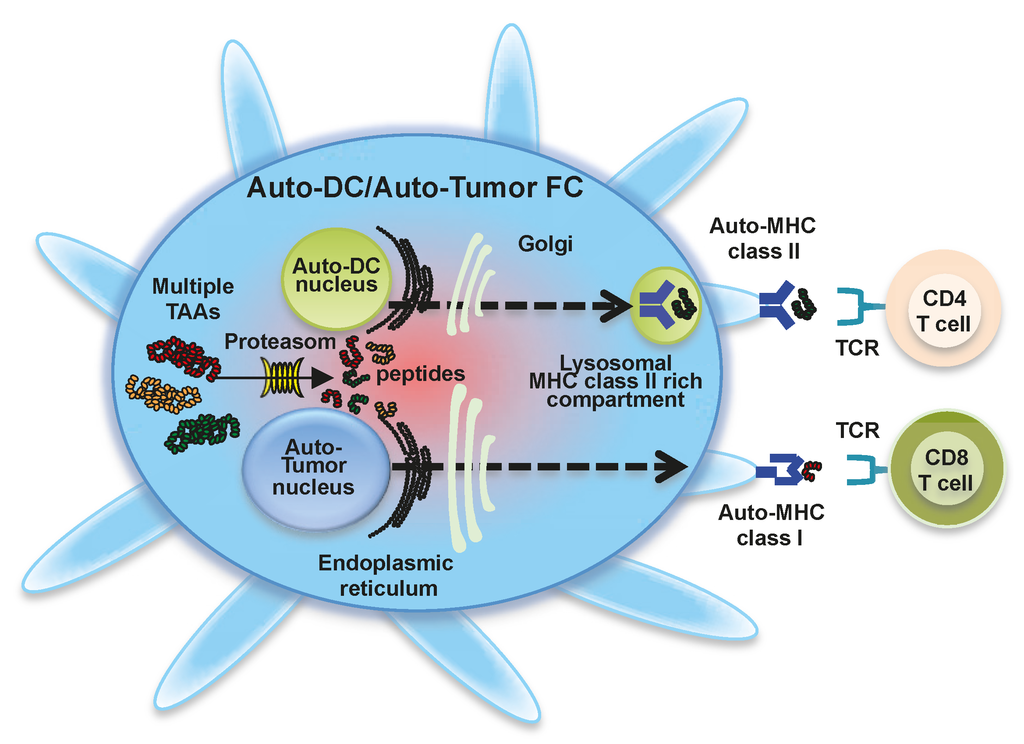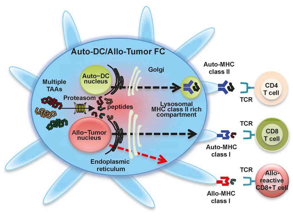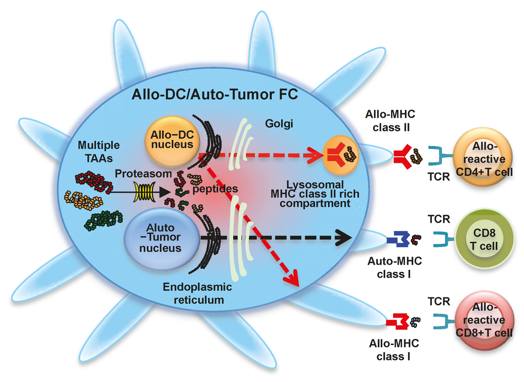 Fusion cells generated with allogeneic dendritic cells and autologous tumor cells. Fusions of allogeneic dendritic cells (Allo-DCs) and autologous tumor cells (Allo-DC/Auto-Tumor FC) display a characteristic phenotype comprised of MHC class I molecules from allogeneic DCs and autologous tumor cells, MHC class II molecules from allogeneic DCs, co-stimulatory molecules (CD80 and CD86), and multiple tumor-associated antigens. Multiple tumor-associated antigens from autologous tumor cells are degraded by proteasome in Allo-DC/Auto-Tumor FC (solid line arrow), and antigenic peptides are loaded onto MHC class I molecules from allogeneic DC (red-colored dash line arrow) and autologous tumor cell (black-colored dash line arrow) in the endoplasmic reticulum. The peptide-MHC class I complexes are then expressed on the Allo-DC/Auto-Tumor FC surface and stimulate polyclonal antigen-specific CD8+ T cells and alloreactive CD8+ T cells. Allo-DC/Auto-Tumor FC can also synthesize MHC class II-restricted antigenic peptides in the endoplasmic reticulum. These are transported to the cytoplasm, where peptide-allogeneic MHC class II complexes are generated (red-colored dash line arrow). Peptide-allogeneic MHC class II complexes are also expressed on the Allo-DC/Auto-Tumor FC surface and activate alloreactive CD4+ T cells. Moreover, antigens derived from Allo-DC/Auto-Tumor FC are also be cross-presented by host DCs, resulting in the induction of polyclonal antigen-specific CD4+ and CD8+ T cells.