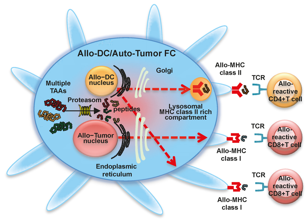 Fusion cells generated with allogeneic dendritic cells and allogeneic tumor cells. Fusions of allogeneic dendritic cells (Allo-DCs) and allogeneic tumor cells (Allo-DC/Allo-Tumor FC) display a characteristic phenotype comprised of MHC class I molecules from allogeneic DCs and allogeneic tumor cells, MHC class II molecules from allogeneic DCs, co-stimulatory molecules (CD80 and CD86), and multiple tumor-associated antigens. Multiple tumor-associated antigens from allogeneic tumor cells are degraded by proteasome in Allo-DC/Allo-Tumor FC (solid line arrow), and antigenic peptides are loaded onto MHC class I molecules from allogeneic DC (red-colored dash line arrow) and allogeneic tumor cell (red-colored dash line arrow) in the endoplasmic reticulum. The peptide-MHC class I complexes are then expressed on the Allo-DC/Allo-Tumor FC surface and stimulate alloreactive CD8+ T cells. Allo-DC/Allo-Tumor FC can also synthesize MHC class II-restricted antigenic peptides in the endoplasmic reticulum. These are transported to the cytoplasm, where peptide-allogeneic MHC class II complexes are generated (red-colored dash line arrow). Peptide-allogeneic MHC class II complexes are also expressed on the Allo-DC/Allo-Tumor FC surface and activate alloreactive CD4+ T cells. Moreover, antigens derived from Allo-DC/Allo-Tumor FC are also be cross-presented by host DCs, resulting in the induction of polyclonal antigen-specific CD4+ and CD8+ T cells.