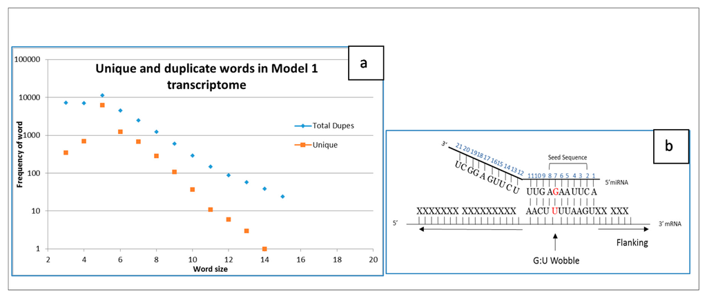 (a) Measures of number of unique and duplicate words in Simple Model transcriptome for various word size; (b) Correspondence to size of seed sequence for miRNAs. Red base pair is an allowed non-canonical matching.