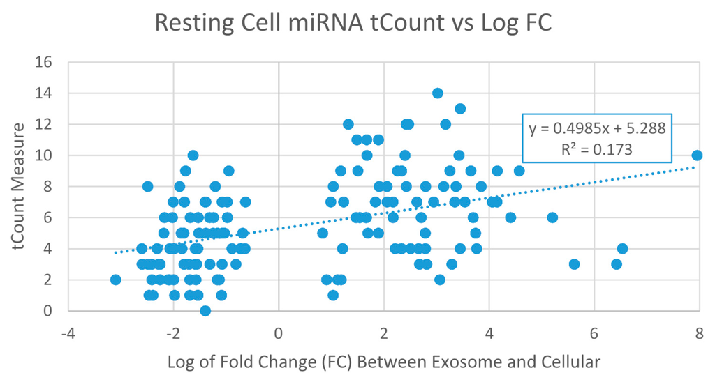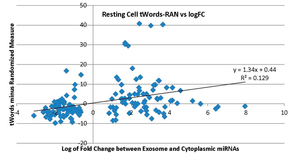 The Villarroya-Beltri [12] study performed microarrays on cellular and exosome fractions from resting and activated human T lymphocytes. They assessed whether certain RNAs are specifically classified into exosomes, and performed a microarray analysis of activation-induced variations in the miRNA and mRNA profiles of primary T lymphoblast and their exosomes. We used that data found in their Supplementary Data and data publicly available at Gene Expression Omnibus through GEO Series accession number GSE50972. Their microarray analysis showed that in most cases miRNAs modulated upon activation are different in cells and exosomes, either for upregulated or downregulated miRNAs. This shows that miRNA and mRNA loading into exosomes remains not a passive process. Certain miRNAs were more highly expressed in exosomes than in cells and in most circumstances this difference is preserved under resting and activated conditions. Similarly, most miRNAs that are more highly represented in cells than in exosomes keep this tendency free from the activation state of the cell. Then they classified some miRNAs as thus specifically sorted into exosomes (EXOmiRNAs), whereas others are specifically retained in cells (CLmiRNAs). We calculated the tCount of raw counts of words in common with the simple transcriptome and tWord, which factors the expression level of that word. Other measures compared tCount and tWord to a randomized transcriptome (RAN). We used a word size w = 7 roughly equal to the seed sequence length as shown in the peaks in Figure 1a,b. Figure 2 shows a clear tendency for the EXOmiRNA cluster on the right (average Log FC of 2.70) to be greater in value (average tCount of 6.80) than the CLmiRNAs (average Log FC of −1.62) in the left cluster of the data points with an average tCount of 4.32. A t-test between the two clusters gives a p-value of 3.2 × 10−7, indicating a significant difference between exosome and cytoplasmic miRNAs as measured with the tCount measure calculated from a simple transcriptome. To allow comparison with other classes of RNA, we can normalize the transcript size by dividing by sequence length. Transforming the tCount measure in Figure 2 increases the correlation coefficient to R2 = 0.185 with y = 0.0236x + 0.242, where x is log FC and y is tCount/Len for word size w = 7.
