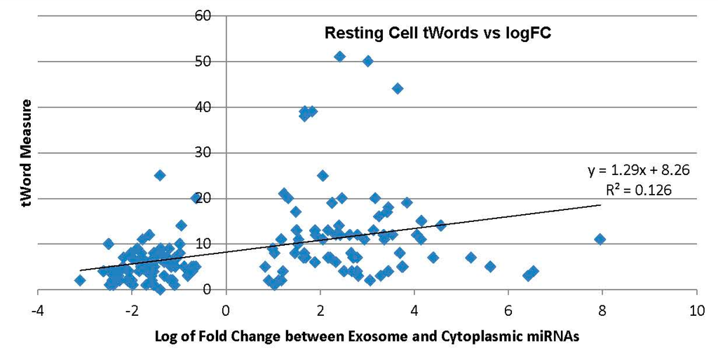 For miRNAs with a resting LogFC, which was positive (average 2.70), values of tWord (mean 12.45) were higher than miRNAs with negative LogFC (average −1.62) for tWord (mean 5.47), and hence tWord was greater with miRNAs enriched in exosomes compared to cytoplasmic miRNAs in Figure 3.