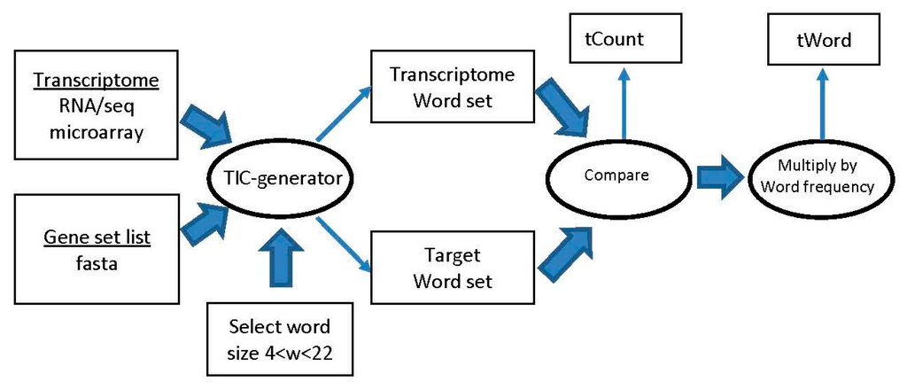 A sliding window variable size word generator (TIC-generator) from input sequences was written in C++. A workflow functional diagram is shown in Figure 5. The output from TIC-generator is a listing of all words contained in each transcript, together with its frequency of occurrence. The lists of words from the eight transcripts were combined, and then duplicates removed. The number of duplicates and unique words resulting from duplicate removal is listed in Table 3. We provide program listing for the dissemination of software from the project in Supplementary Material, including software, tools and related resources, to the relevant research and user communities using open source resources.