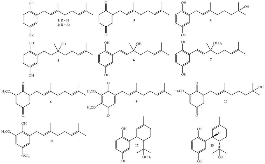 - De Rosa, S.; De Giulio, A.; Iodice, C. Biological effects of prenylated hydroquinones: structure-activity relationship studies in antimicrobial, brine shrimp, and fish lethality assays. J. Nat. Prod. 1994, 57, 1711–1716. [Google Scholar] [CrossRef] [PubMed]