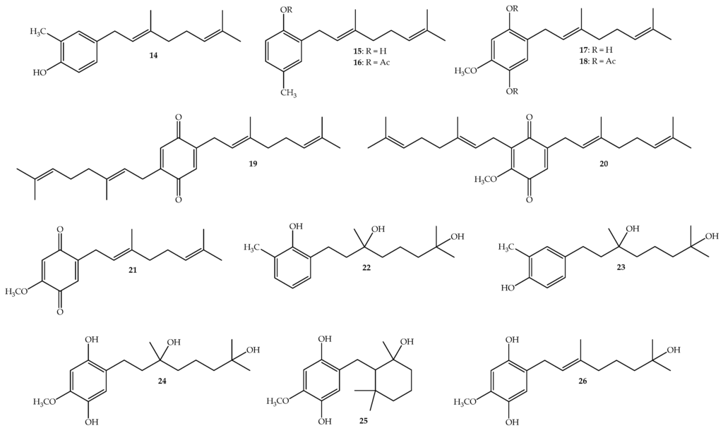 - Simon-Levert, A.; Menniti, C.; Soulere, L.; Geneviere, A.M.; Barthomeuf, C.; Banaigs, B.; Witczak, A. Marine natural meroterpenes: Synthesis and antiproliferative activity. Mar. Drugs 2010, 8, 347–358. [Google Scholar] [CrossRef] [PubMed]