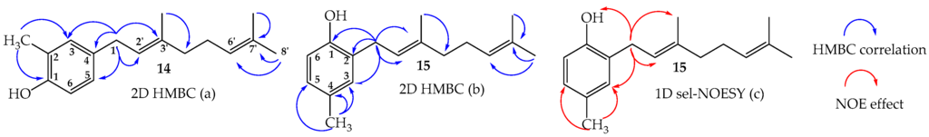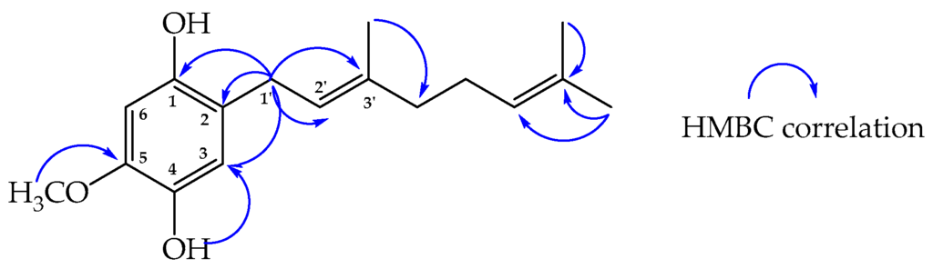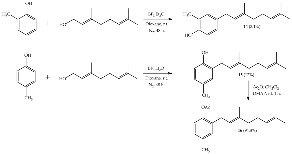 - Taborga, L.; Vergara, A.; Osorio, M.; Carvajal, M.; Madrid, A.; Marilaf, F.; Carrasco, H.; Espinoza, L. Synthesis and NMR structure determination of new linear geranylphenols by direct geranylation of activated phenols. J. Chil. Chem. Soc. 2013, 58, 1790–1796. [Google Scholar] [CrossRef]