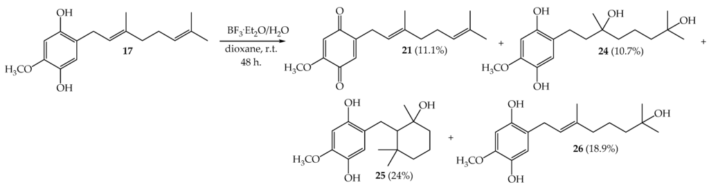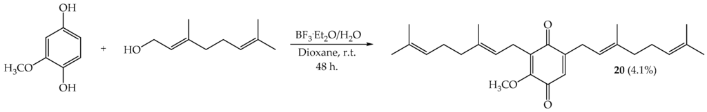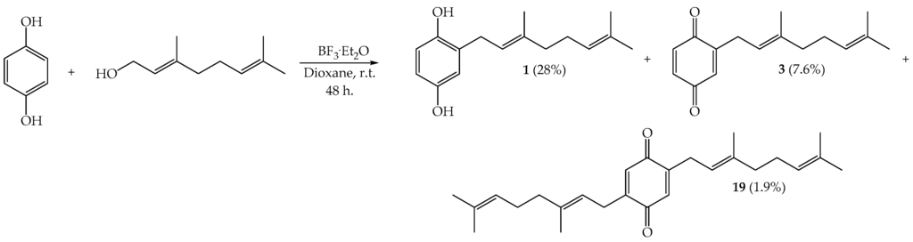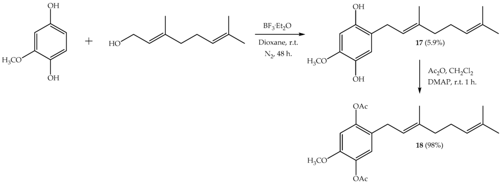 - Chukicheva, I.Y.; Fedorova, I.V.; Koroleva, A.A.; Kuchin, A.V. Synthesis of natural geranyhidroqunone analogs. Chem. Nat. Compd. 2015, 51, 1056–1058. [Google Scholar] [CrossRef]
