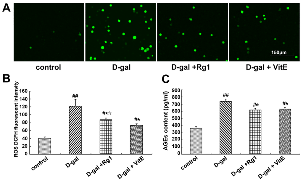 Effects of ginsenoside Rg1 on ROS level and AGEs content in the mouse model of d-gal-induced aging. (A) The DCFH (dichlorodi hydrofluorescein diacetate) fluorescence level of ROS is shown. In the d-gal group, more positive green fluorescence was observed through laser scanning confocal microscopy. There were fewer ROS-stained Sca-1+ HSC/HPCs in the d-gal + Rg1 group than in the d-gal model group. Green indicates ROS staining. Scale bar = 150 μm; (B) Quantification assays of the ROS level are shown. Intracellular ROS generation was detected through flow cytometry. In the d-gal model group, the DCFH fluorescence intensity was evidently higher than that in the other groups; (C) Effects of ginsenoside Rg1 on AGEs in aging mice serum. AGE content in the d-gal group was significantly higher compared to the other groups (mean ± SD, n = 5; # p < 0.05, ## p < 0.01 vs. the control group, * p < 0.05 vs. the d-gal model group, ☆ p < 0.05 vs. the d-gal + VitE group).