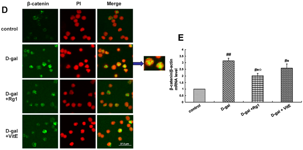 Furthermore, the gene expression of β-catenin was detected by RT-PCR. As shown in Figure 3E, β-catenin mRNA expression was upregulated in the d-gal model group compared to the other three groups (* p < 0.05, ## p < 0.01). After treatment with ginsenoside Rg1, the β-catenin mRNA expression was clearly lower than that in the d-gal + VitE group (☆ p < 0.05).