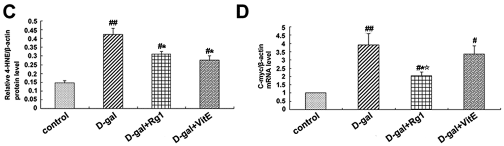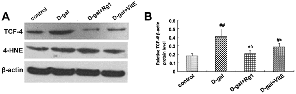 Through the activation of the canonical Wnt signaling pathway, cytosolic β-catenin is stabilized and translocates to the nucleus where it binds to T cell factor/lymphoid enhancer factor (TCF/LEF) and induces TCF/LEF-dependent transcription. Then, the Wnt downstream target gene transcription is also activated, such as c-Myc. In addition, 4-HNE is a kind of oxidative stress product formed during lipid peroxidation. It is present at higher levels during oxidative stress. According to Figure 5, the expressions of c-Myc mRNA, TCF-4, and 4-HNE in the d-gal group were obviously higher than in the control group (## p < 0.01), while ginsenoside Rg1 treatment remarkably reduced the c-Myc mRNA, TCF-4, and 4-HNE expressions compared to d-gal administration alone.