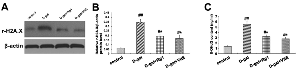 It is well-known that the DNA damage response (DDR), p16Ink4a-Rb and p19Arf -p53-p21Cip1/Waf1 pathways are important biological mechanisms in the stem cell aging process []. Recent experiments confirmed that in the process of aging, there was an accumulation of DNA damage, which restricted the self-renewal capacity of HSCs [,]. The r-H2A.X expression is an indicator of the DNA damage extent and 8-OHdG is an established indicator of DNA oxidative stress injury. The present study showed the expressions of r-H2A.X and 8-OHdG were increased in d-gal-induced mice, while they were down-regulated in different degrees after the administration with ginsenoside Rg1 or VitE (Figure 6). Furthermore, the reduced expressions of p21Cip1/Waf1, p53, Rb and p16Ink4a induced by Rg1 demonstrated that ginsenoside Rg1 could attenuate the expressions of senescence-associated protein and genes in Sca-1+ HSC/HPCs from d-gal-induced aging mice. Previous research has demonstrated the accumulation of ROS could result in DNA damage [] and the activity of p53 [], p16Ink4a []. In conclusion, DDR and the p16Ink4a-Rb and p53-p21Cip1/Waf1 pathways may be involved in Sca-1+ HSC/HPC aging from the d-gal-induced mouse model. Moreover, ginsenoside Rg1 could regulate these age-related pathways to delay Sca-1+ HSC/HPC aging, which may abate the oxidative stress reaction in vivo.