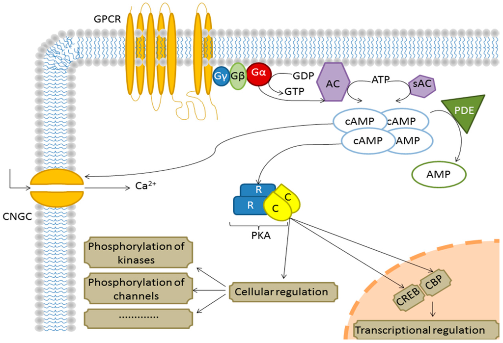 An illustration of some signal transduction pathways mediated by the G-protein coupled receptor based on the animal system. When adenylyl cyclase (AC) is activated by the Gα-subunit of the G-protein coupled receptor (GPCR), it catalyzes the formation of cAMP. Cyclic AMP then activates many substrates and kinases such as protein kinase A (PKA) which will regulate many biological processes. Cyclic nucleotide-gated channel (CNGC); soluble adenylyl cyclase (sAC); phosphodiesterase (PDE); cAMP response element-binding (CREB); CREB-binding protein (CBP); catalytic subunit of PKA (C); regulatory subunit of PKA (R).