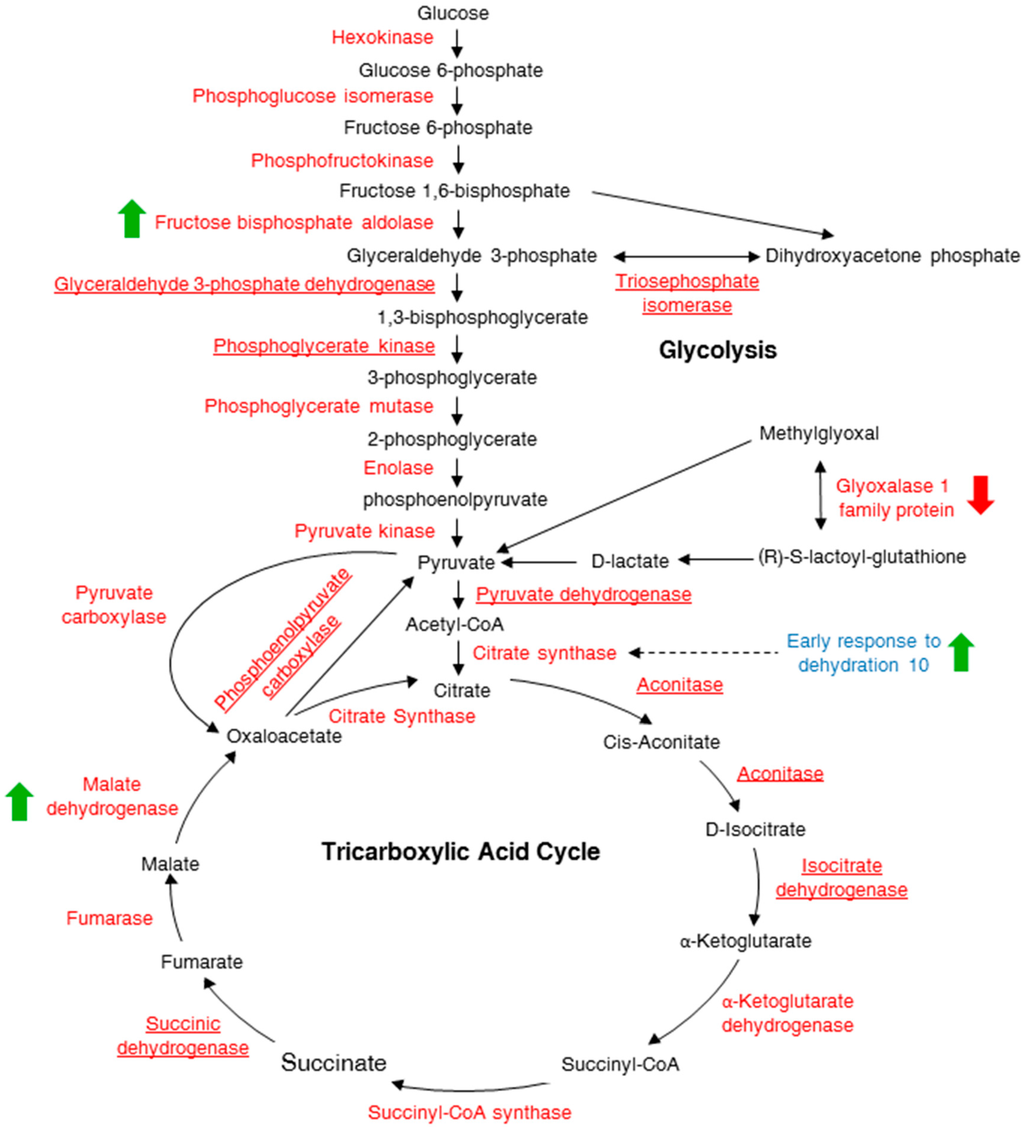 A schematic diagram of the glycolysis and tricarboxylic acid (TCA) cycle pathways showing proteins differentially expressed post cAMP treatment. The glycolysis and TCA metabolic products are shown in black, the enzymes are in red and a protein associated with the TCA cycle is shown in blue. The green arrows indicate proteins that accumulate in response to cAMP while the red arrow indicates a protein that is reduced in quantity. All the other proteins underlined are some of the proteins identified in the current study that are not changing in abundance after cAMP treatment.