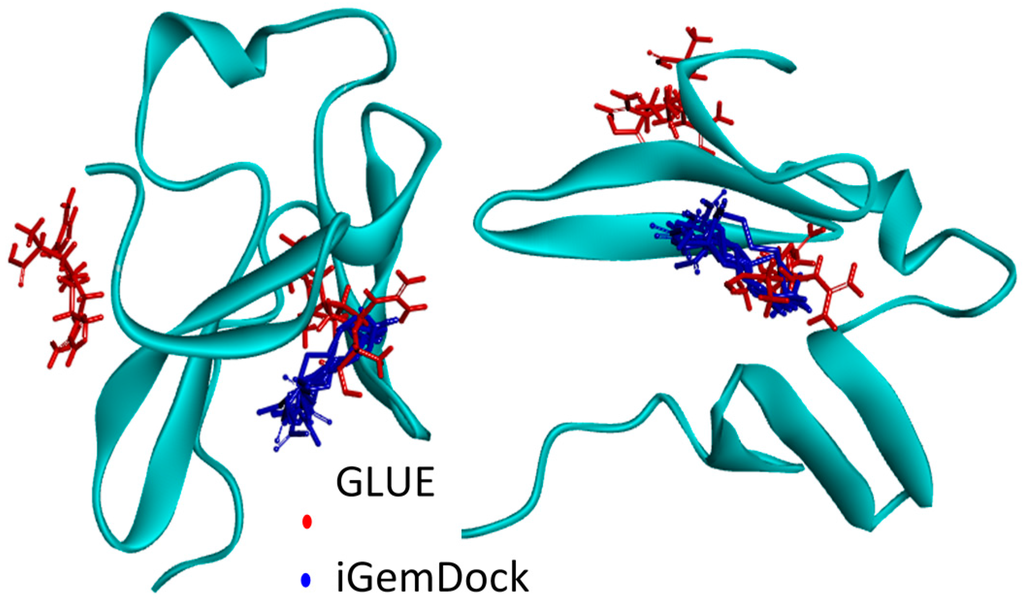 Most protein-small molecule docking software requires some information about the binding site for accurate results. Even though some packages allow for expansion of the area in the protein to be considered, usually by expanding a grid or box, this leads to a loss of definition. The larger the area, the less points within the box will be considered, thus potentially compromising the results. Software packages where the whole protein must be screened for potential sites of interaction with excipients would not suit the aim of this study. To develop the docking method, two different protein-small molecules software packages were initially used: GLUE [] and iGemDock [].