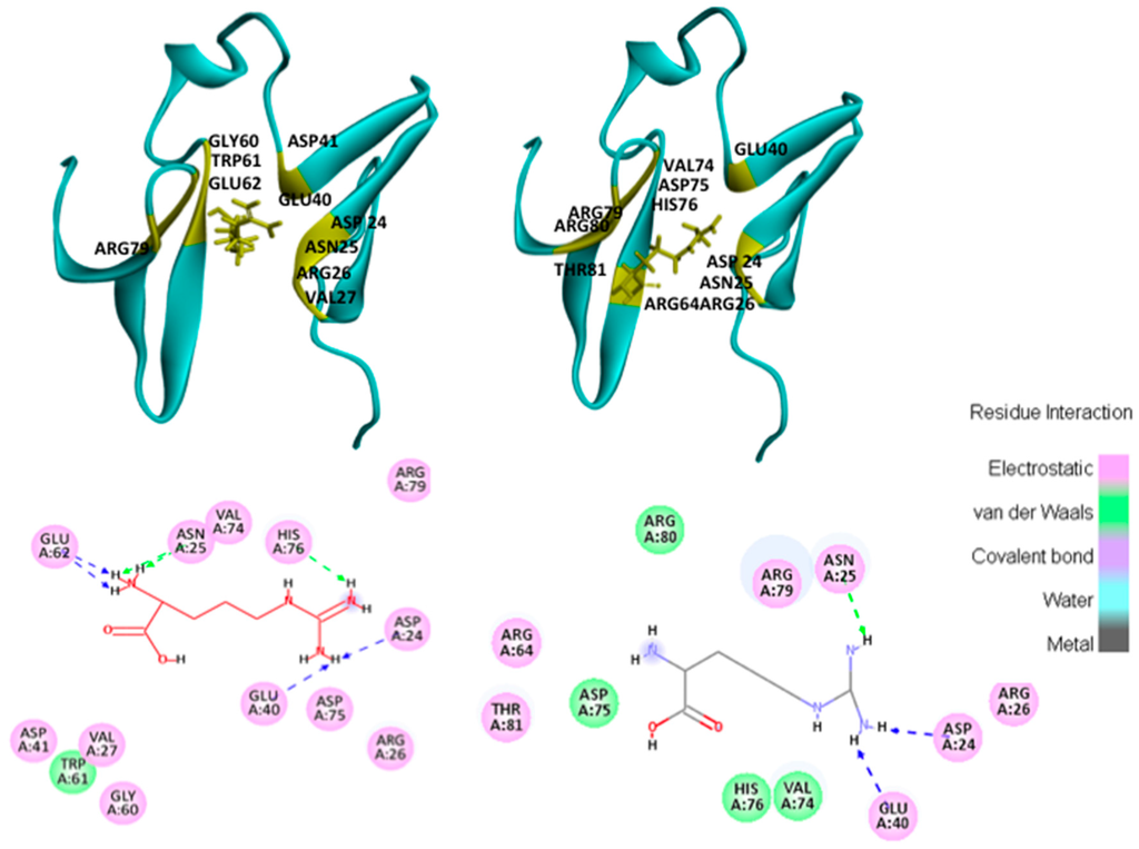 The synergistic effects for the combined use of arginine and glutamic acid to increase protein solubility was further described by Shukla et al. [] using preferential interaction coefficients (Γ23) and molecular dynamics. It was thought that interactions between the two amino acids (Arg and Glu) increase their presence on the protein surface, therefore reducing the number of protein–protein interactions. The synergistic effect of two amino acids used as excipients increased the number of Glu and Arg molecules close to the protein surface when compared to the individual addition of Arg or Glu only, and this synergistic effect was reported to be responsible for an increased solubility effect on WW34 []. More relevant to our work, the location of excipient molecules close to the nearest amino acid on the protein surface was determined using molecular dynamics simulation [], and those were reported as excipient binding sites. These sites were taken as the benchmark for our molecular docking methodology.