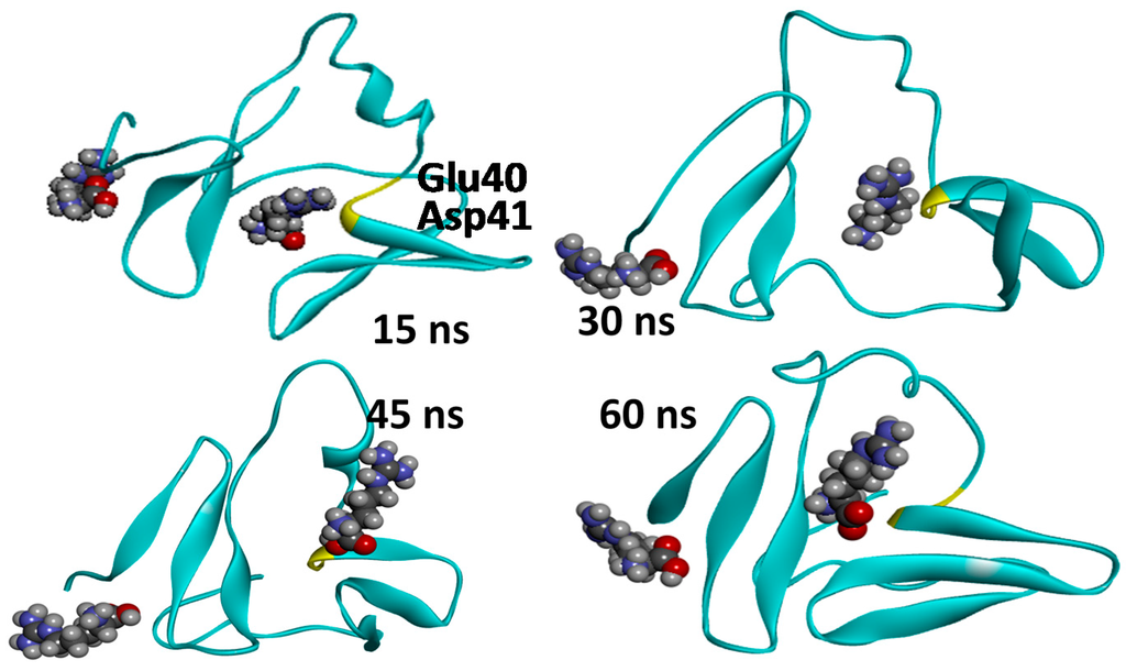 Snapshots of the 60-ns MD simulation performed with the solutions obtained from GLUE. Two Arg molecules were considered so that both hotspots identified by GLUE were represented. WW34 protein is displayed as ribbons in green and the two arginine molecules are displayed as CPK and coloured by element. The reference residues Glu40 and Asp41 are highlighted in yellow in each snapshot.