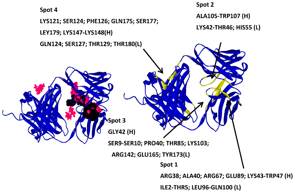 Hex was used to perform protein–protein docking with Fab A33. This allowed further validation of the hotspots by evaluating if the residues that were involved in the interaction between two Fab A33 molecules were the same as the ones interacting with the excipients. Figure 11 shows one of the obtained solutions from the molecular docking experiment. For this analysis, the three lowest energy solutions were considered (Table 6).