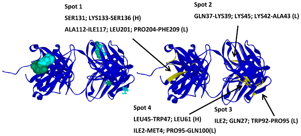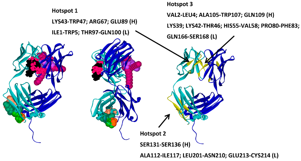 With all the information collected, it was possible to identify and define three hotspots for the interaction of A33 with the excipients (Figure 10; Table 5): one hotspot where sucrose and trehalose interacted most favourably, a second hotspot where both saccharides and amino acids interact, and finally the third hotspot where only surfactants docked (Figure 10). Hotspots 2 and 3 are located mainly in the light chain of A33 (Table 5).