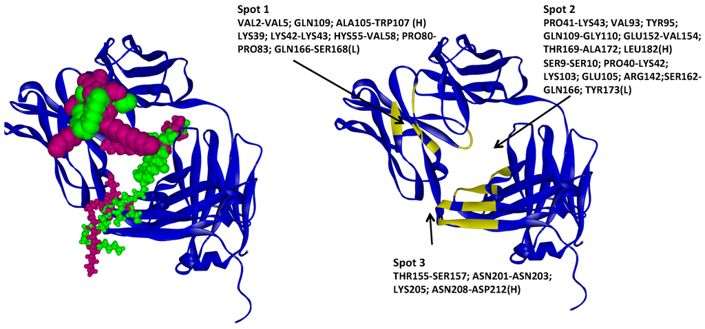 Molecular docking results for arginine and glycine obtained with GLUE software. A33 is displayed in blue ribbons, arginine in green and glycine in red (left); The higher affinity molecules are displayed as larger CPK. A33 residues involved in each identified spot (right).