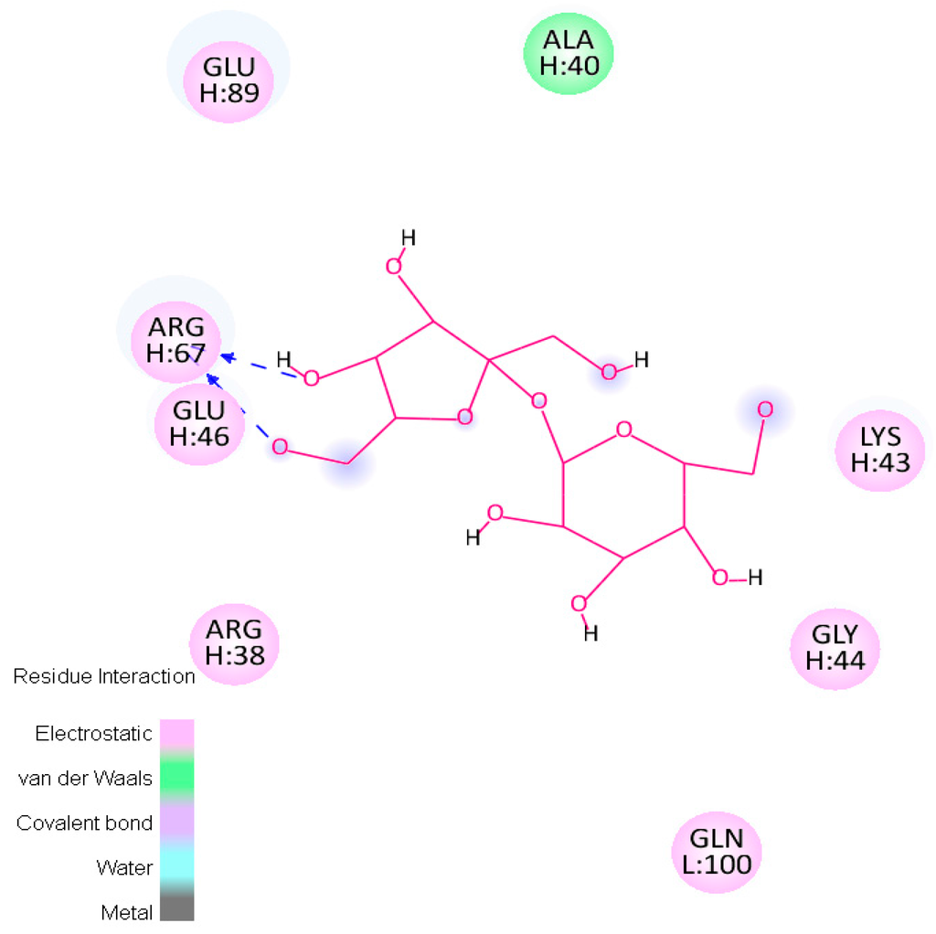 Molecular docking results for trehalose and sucrose obtained with GLUE software. A33 is displayed in blue ribbons, trehalose in black, and sucrose in pink (left); The higher affinity molecules are displayed as larger CPK. A33 residues involved in each identified spot (right).