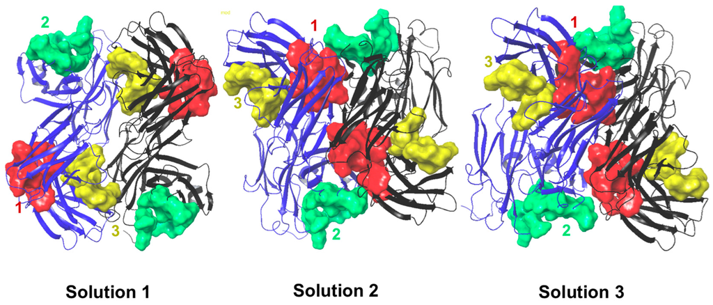 Docking solutions for interaction between two A33 molecules obtained with Hex. The A33 molecule defined as target is displayed in blue ribbons, and the molecule defined as ligand in grey. The hotspot surfaces are shown for both molecules and coloured according to the following scheme (Hotspot 1—red; Hotspot 2—green; and Hotspot 3—yellow).