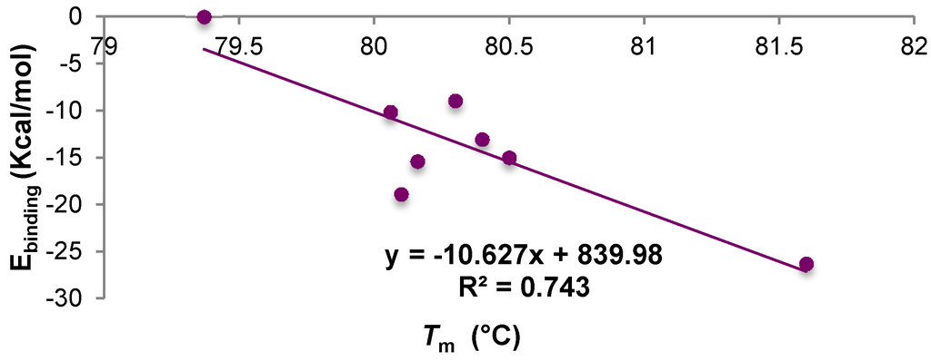 Correlation between molecular docking results, expressed as a binding affinity and experimental results, Tm.