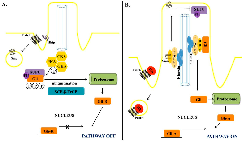 Hedgehog signaling pathway and the primary cilia. (A) In the absence of Hedgehog (Hh) ligand, Gli localizes in the cytoplasm as part of an inhibitory complex with Fused kinase (Fu) and Suppressor of Fused (SuFu), which allows the sequential phosphorylation by several kinases: Protein kinase A (PKA), glycogen synthase-3β (GSK3β) and casein kinase-1 (CK1). Thereafter, ubiquitination by Skip-Cullin-F-box (SCF) protein/β-Transducing repeat Containing Protein (TrCP) primes the phosphorylated Gli to limited proteosomic degradation, exposing the N-terminal repressor domain (GliR), which translocates to the nucleus and represses; (B) When Hh ligand binds to Ptch, it releases the inhibitory effect of Ptch on Smo that localizes in cytoplasmic vesicles. Smo then undergoes anterograde movement along the cilia, directed by kinesin and facilitated by the ciliary proteins Bardet-Biedl syndrome proteins (BBS) and intraflagellar transport proteins (IFP). At the tip of the cilia, Smo releases Gli from the suppressor complex, allowing it to move along the cilia, directed by dynein proteins. Unphosphorylated Gli undergoes limited proteosomal degradation, exposing the C-terminal activator domain (GliA), which translocates to the nucleus promoting gene transcription.
