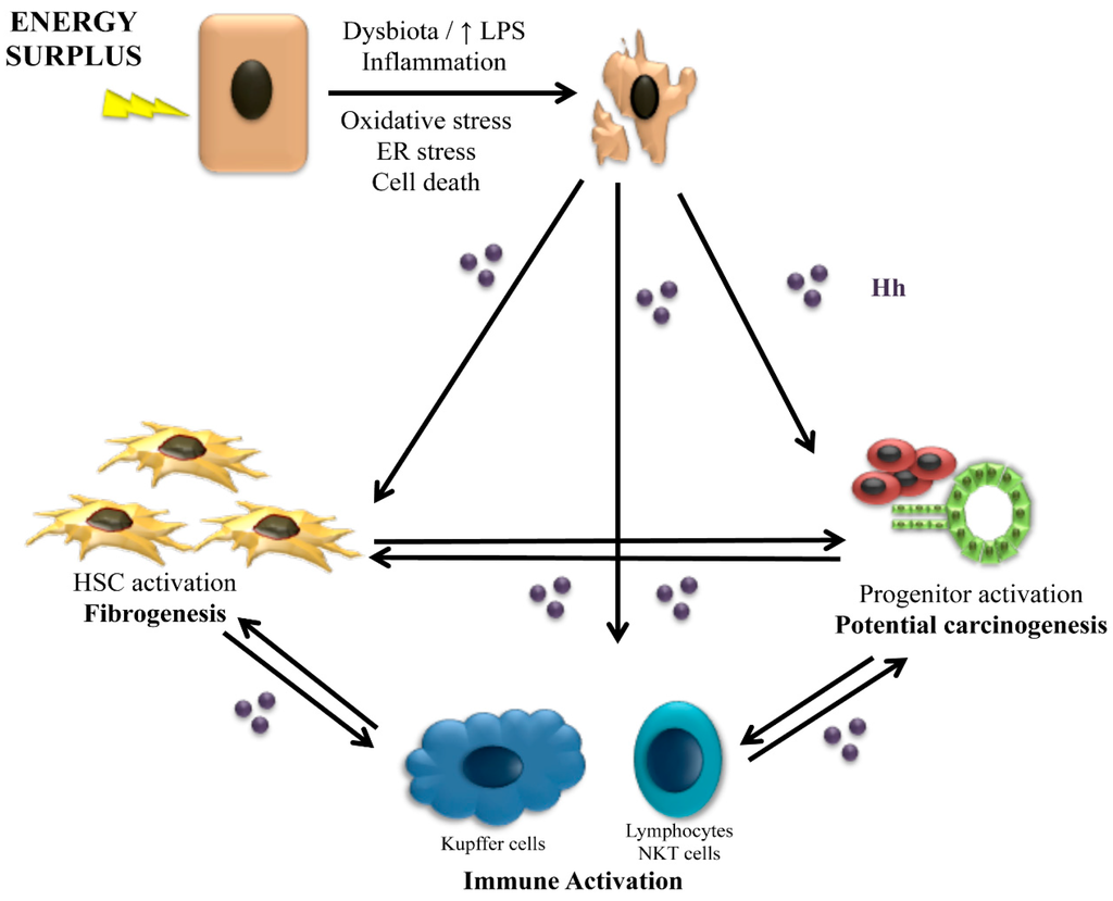 The role of Hedgehog on the wound-healing response. Energy surplus leads to fat accumulation in the hepatocytes, which promote oxidative stress, endoplasmic reticulum (ER) stress and cell death. The injury of hepatocytes is promoted by an inflammatory state, among other factors, favored by a deregulated gut microbiota and increase in lipopolysaccharide (LPS). Injured and dying hepatocytes release hedgehog ligands (Hh) that act on the immune system increasing inflammation, in stellate cells and progenitors cells activating them and inducing fibrogenesis and pathways of hepatocarcinogenesis. Once started, the regenerative/repair response perpetuates through crosstalk between the different cell types involved.