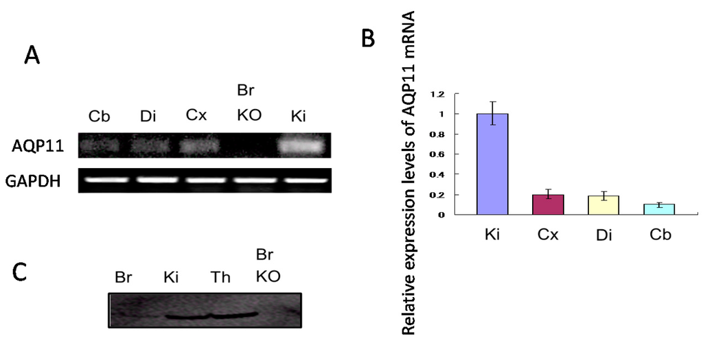 Expression levels of Aquaporin-11 (AQP11) in the brain (A) Reverse transcription (RT)-PCR for AQP11 messenger ribonucleic acid (mRNA) in wild type P28 mouse brain and kidney of AQP11-deficient mouse brain; (B) Relative abundance of brain AQP11 mRNA in wild-type mouse was compared with that of the kidney. All signals were normalized to the glyceraldehyde-3-phosphate dehydrogenase (GAPDH) mRNA signal. Each bar represents mean ± SD of three experiments; (C) Immunoblotting for AQP11 of P28 in the brain, thymus, and kidney of wild type mice and in the brain of AQP11-deficient mice. Cb, cerebellum; Cx, cerebral cortex; Di, diencephalon; Ki, kidney; Th, thymus; Br KO, the whole brain of AQP11-deficient mice.