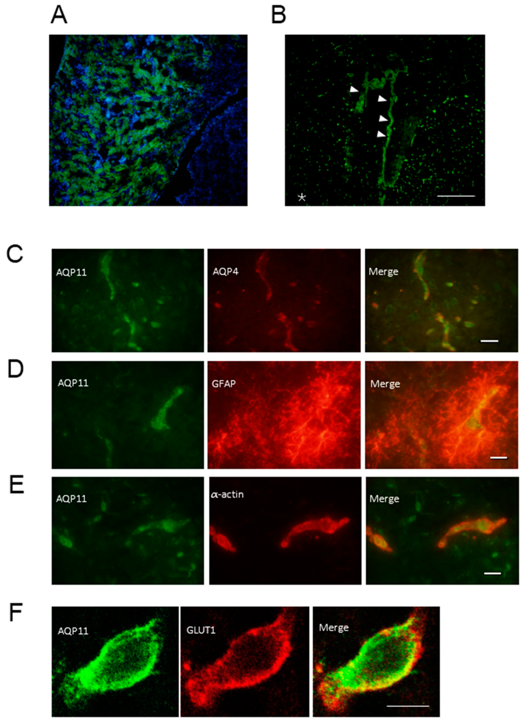 Localization of AQP11 in the kidney and brain (A) Immunofluorescence staining for AQP11 (green) and 4′,6-diamidino-2-phenylindole dihydrochloride (blue) for nuclear counterstaining in the kidney of the wild type at P28; (B) Immunofluorescence staining for AQP11 (green) in the fourth ventricle of the wild type at P28. The arrow heads indicate the choroid plexus. The asterisk (*) indicates the cerebral grey matter. Scale bar, 200 µm; (C–F) The double immunofluorescence of AQP11 (green) in the cerebral cortex of the wild type at P28; (C) with AQP4 (red; the scale bar, 20 µm); (D) with glial fibrillary acidic protein (GFAP) (red; the scale bar, 10 µm); (E) with α-actin (red; the scale bar, 10 µm); and (F) with GLUT1 (red; scale bar, 5 µm). Sections were viewed and photographed with a fluorescent microscope (A–D) or confocal scanning microscope (F).