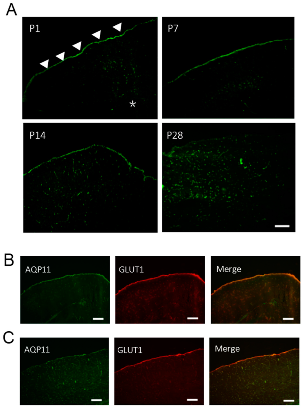 Localization of AQP11 in the brain of P1~P28 (A) Immunofluorescence staining for AQP11 (green) in the brain of P1, P7, P14, and P28. Scale bar, 200 µm; (B,C) Immunofluorescence staining of the cerebral cortex for AQP11 (green) and GLUT1 (red) at P1 (B) and P28 (C). The arrow heads indicate the pia matter. The asterisk (*) indicates the brain parenchyma. The scale bars, 200 µm.