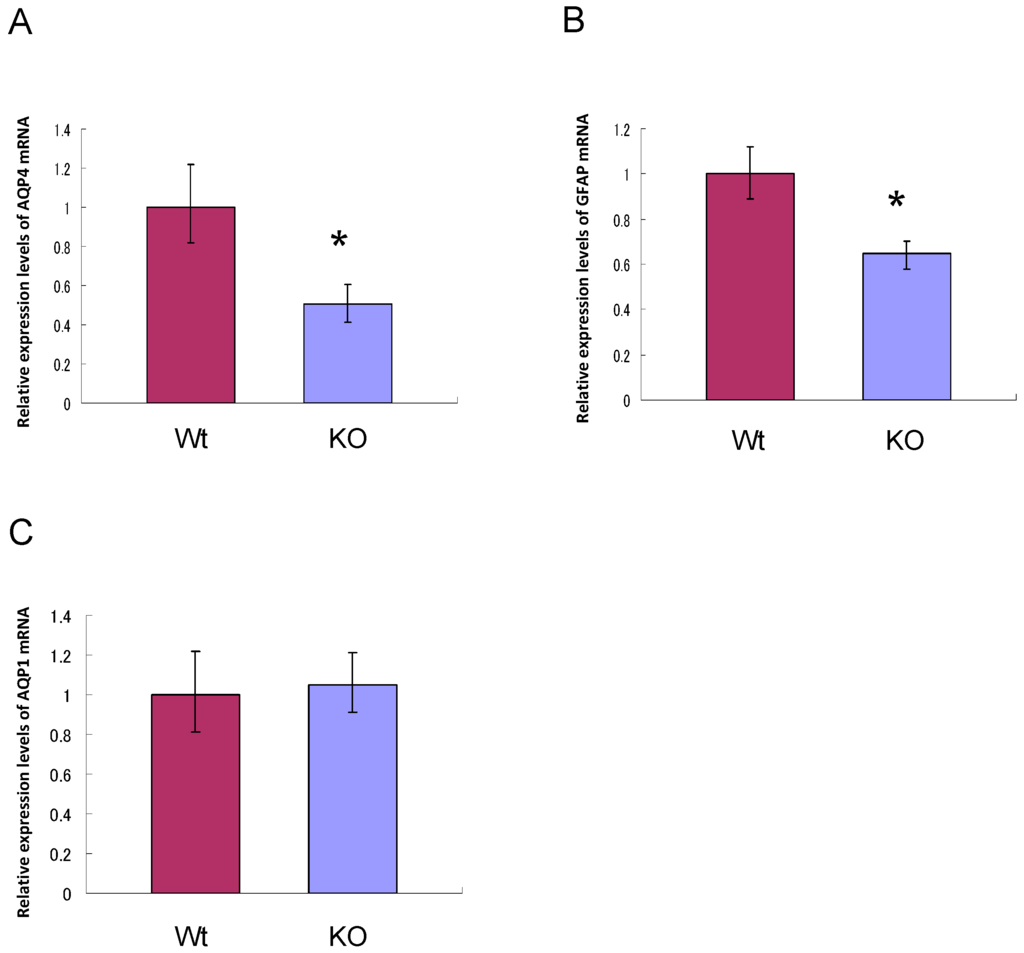 Quantitative real time RT-PCR was performed using TaqMan®RNA-to-CTTM 1-Step Kit (Applied Biosystems, Foster City, CA, USA). RT-PCR amplifications and real-time detection were performed using the ABI Prism 7500 Fast Real-time PCR System (Applied Biosystems). Real-time RT-PCR conditions were the following: 48 °C for 15 min, 95 °C for 10 min, and then followed by 40 cycles of (15 s at 95 °C and 1 min at 60 °C). All purchased TaqMan probes (Applied Biosystems) were from the different exons: GAPDH; Mm99999915_g19, GFAP; Mm01253033_m1, AQP11; Mm00613023_m1, AQP1; Mm00431834_m1, and AQP4; Mm00802131_m1. The results were normalized to GAPDH expression levels. The amount of each gene expression was calculated by using the ΔΔCt method. All experiments were performed in triplicates. Results are shown as a fold change from wild-type mice.