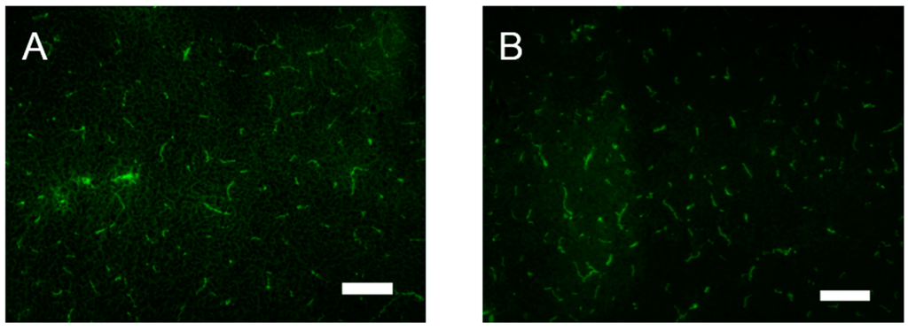 Biotin permeability assay was performed by following a previously described method with minor modifications [17]. Briefly, deeply anesthetized mice were perfused from the heart with 5 mL 1 mg/mL EZ-Link Sulfo-NHS-Biotin (#21217, Thermo Scientific, Waltham, MA, USA) in PBS, followed by 4% paraformaldehyde in PBS. The tissue was fixed in 4% paraformaldehyde overnight and cryoprotected, embedded in OCT compound, cryosectioned, labeled with Alexa-488-streptavidin, and the images were captured using a fluorescent microscope (Olympus IX71).