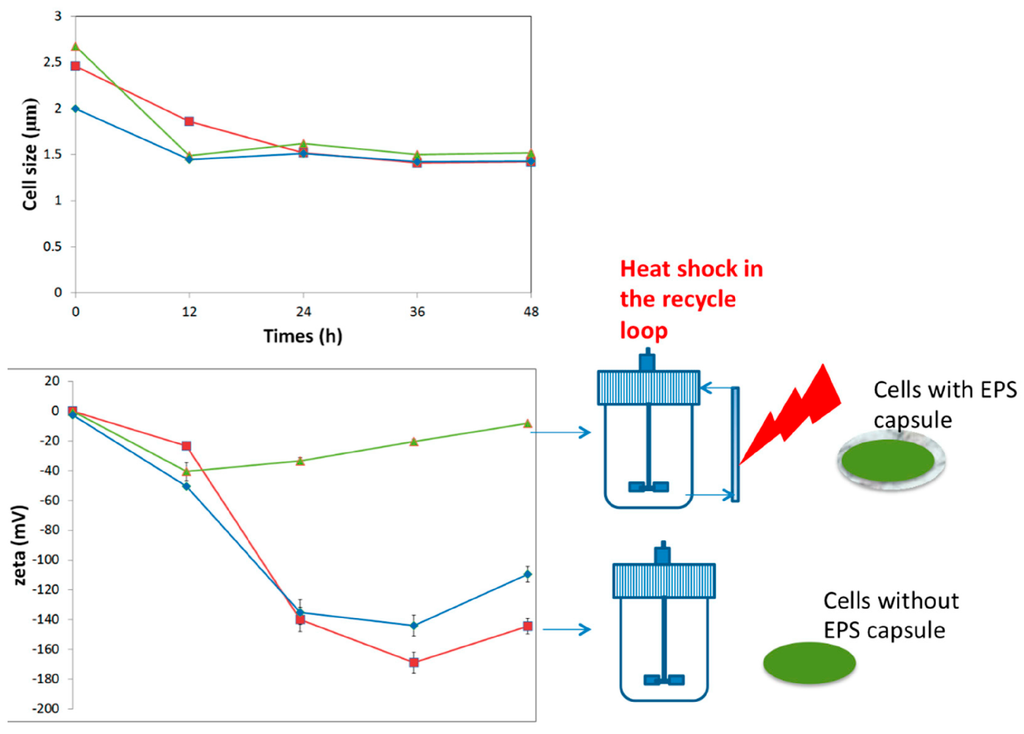 Effect of sub-lethal heat shock (37–42 °C when cells are crossing the recycle loop, two-compartment reactor, see Figure 1) on cell size and zeta potential. Annulation of zeta potential is observed in the case of the bioreactor performed with heat shock. In this case, stress leads to the excretion of an EPS capsule that can be exploited in order to further increase the robustness of the strain during downstream processing operations (adapted from Nguyen []). (square: reference, well-mixed bioreactor, diamond: cold-shock two-compartment bioreactor, triangle: heat-shock two-compartment bioreactor).