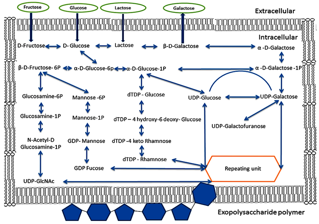 Diagram showing the biosynthetic pathways involved for the production of exopolysaccharides from lactose, fructose, galactose and glucose by lactic acid bacteria.