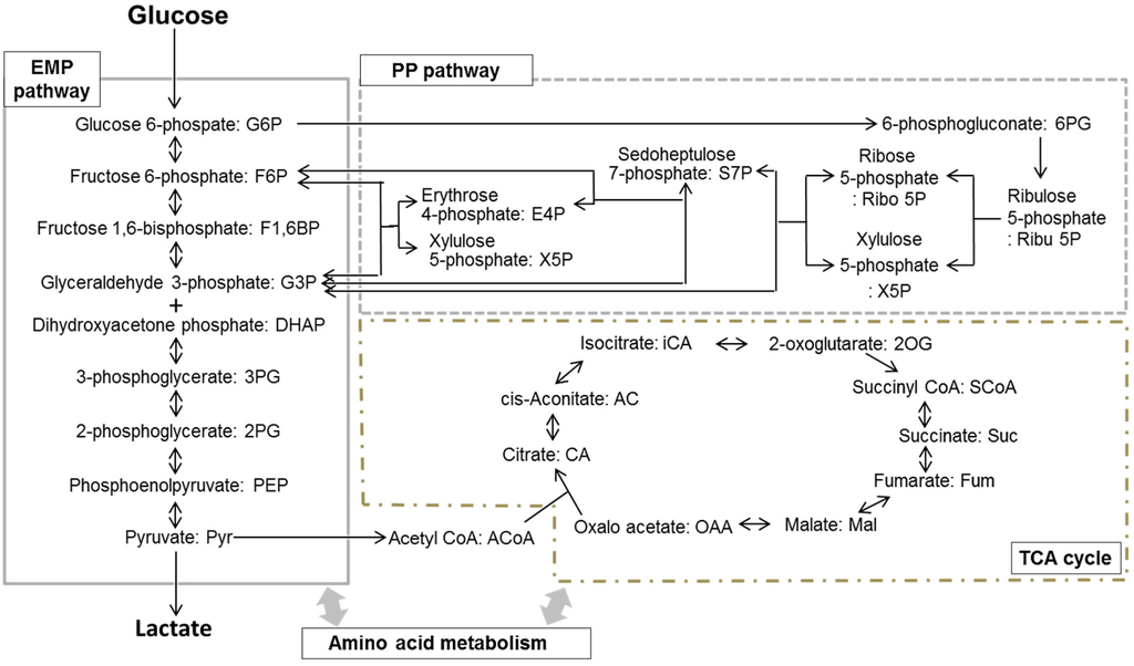 Schema of the central carbon metabolism pathway, including the Embden-Meyerhof-Parnas-pathway (EMP pathway), the pentose-phosphate pathway (PP pathway), and the tricarboxylic acid cycle (TCA cycle).