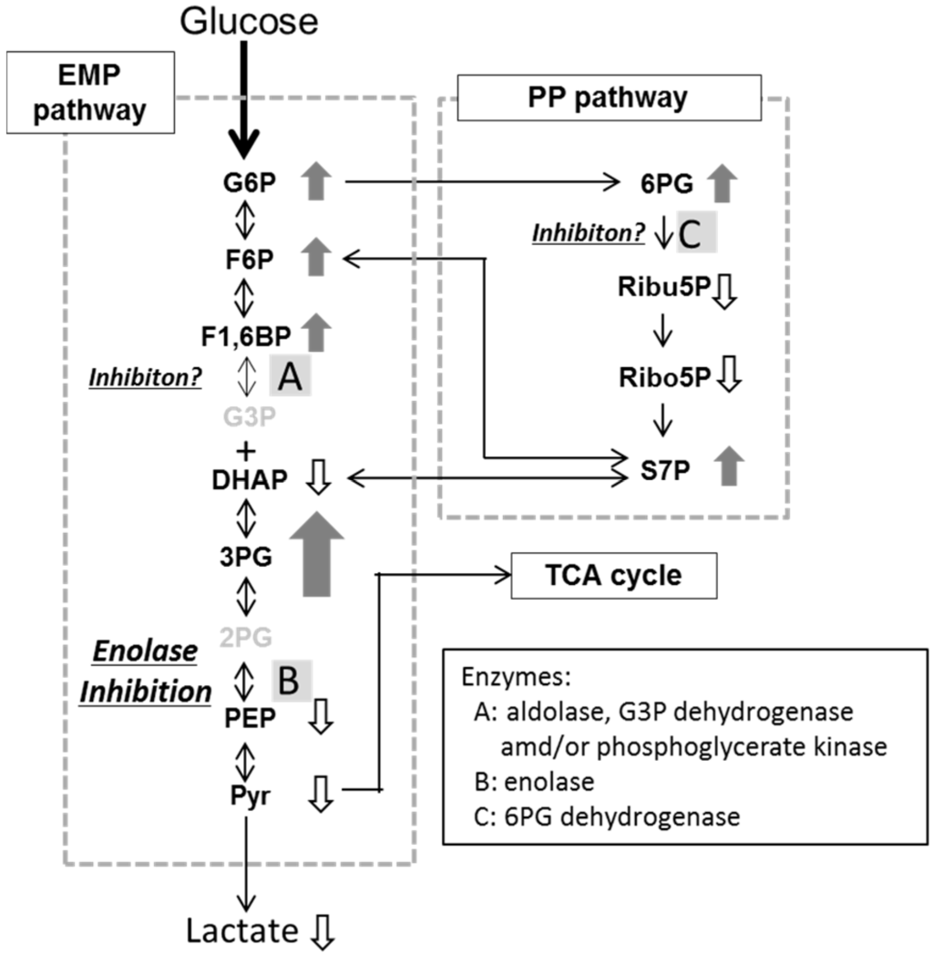 Schema of the effects of fluoride on the central carbon metabolic pathway. Small arrows with metabolite names, significant increases (upward arrow) or reductions (downward arrow) in the levels of the named metabolites. See Figure 1 for an explanation of the metabolite abbreviations.